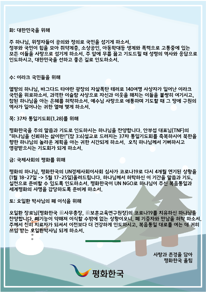 평화한국 2021년 1월 릴레이금식기도문입니다.