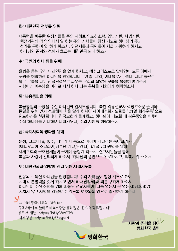 평화한국 2021년 3월 릴레이금식기도문입니다.